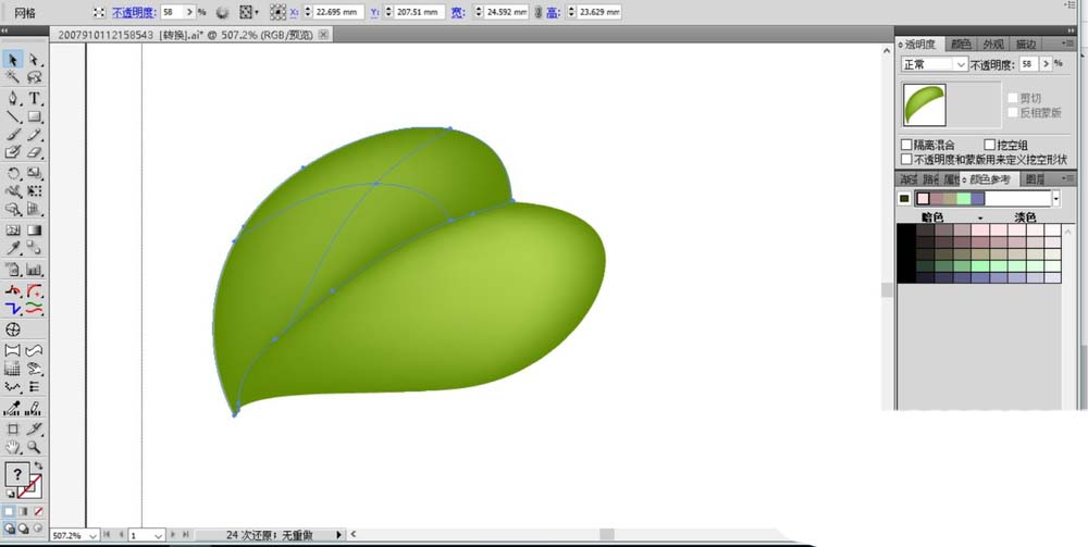 1、先用路径画出一片绿叶的基本轮廓再用网格渐变的方法填充,让其成为一片有着明显色调变化的绿叶感觉。