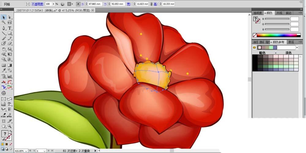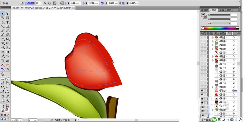 6、复制这个花瓣的路径并缩小到80%左右,我们用网格渐变的工具做出红到黄的渐变感觉。