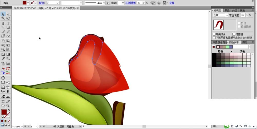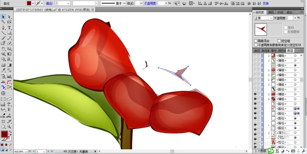 7、在花瓣的表面绘制出暗调的路径,我们用正片叠底的黑色填充,设置黑色为透明度40%左右。