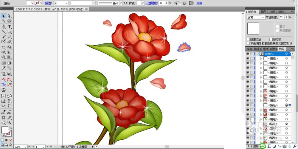 11、在最上面的花朵周围绘制出大小不同的花瓣向四周飞出,改变这些花瓣的色调与大小,完成山茶花图片设计。