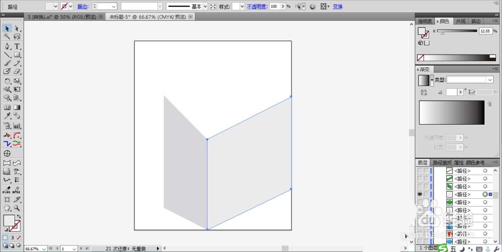 1、先用钢笔画出笔盒的左侧面与右侧面的路径,我们用不同的灰色填充这两个侧面,左侧稍暗一些,右侧稍亮一些。