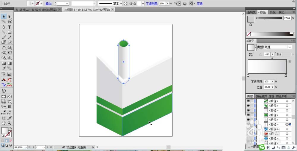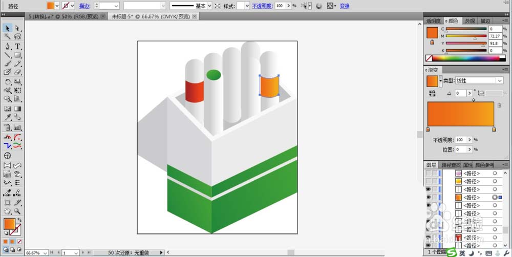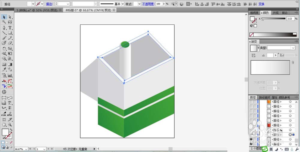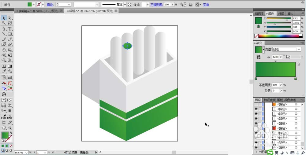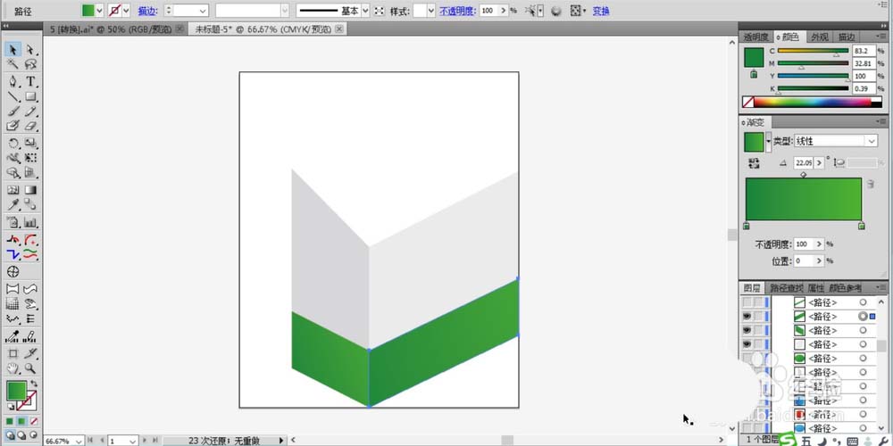 2、继续在笔盒的下方绘制出色块的路径,我们用不同明底的绿色渐变填充笔盒下方图案区域的左侧面与右侧面,让光线从右向左的照射。