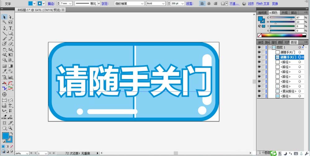 6、复制这个文字填充海蓝色,设置出粗边的效果,让其从前面白色的文字周围呈现出来,完成关门标识设计。