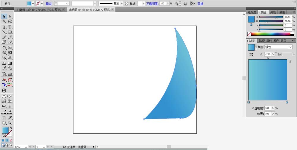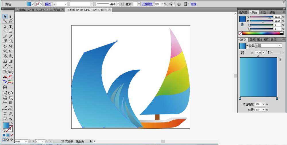 1、先用钢笔画出帆船的风帆形状并填充一个蓝色的渐变。