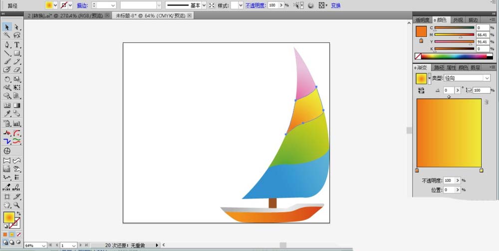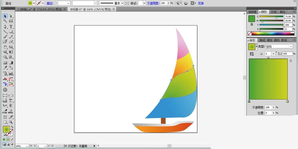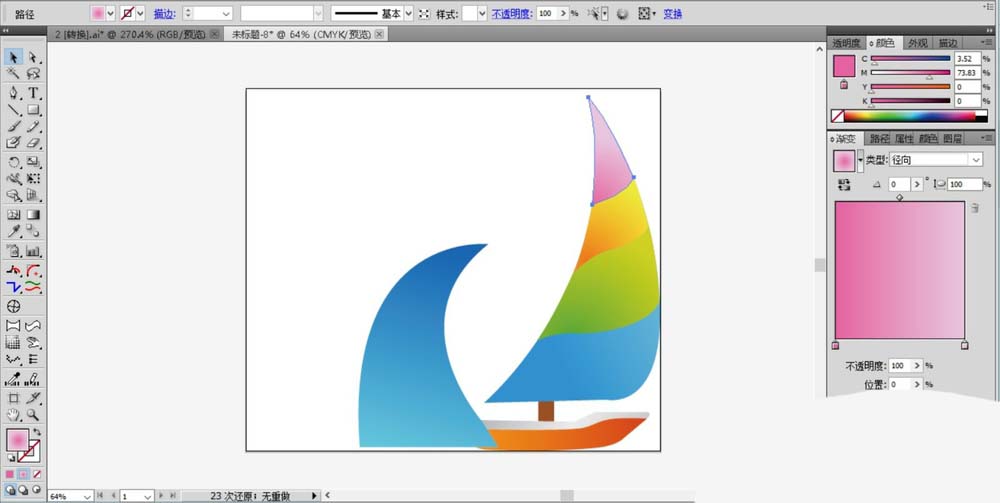 4、接着,我们使用钢笔工具在帆船的风帆上面绘制图案,一共分成上、中、下三个部分,上面填充紫红色的渐变,中间填充橙黄色的渐变,下面填充绿色的渐变。