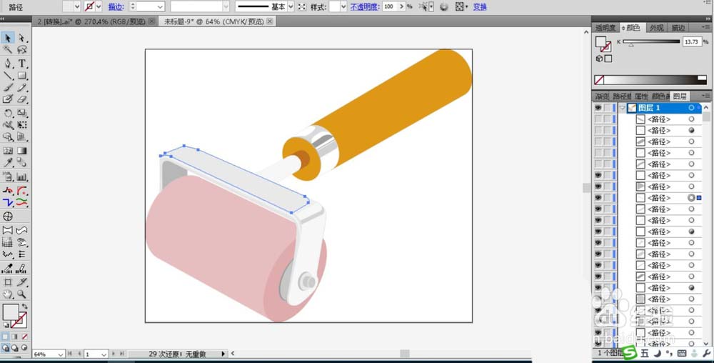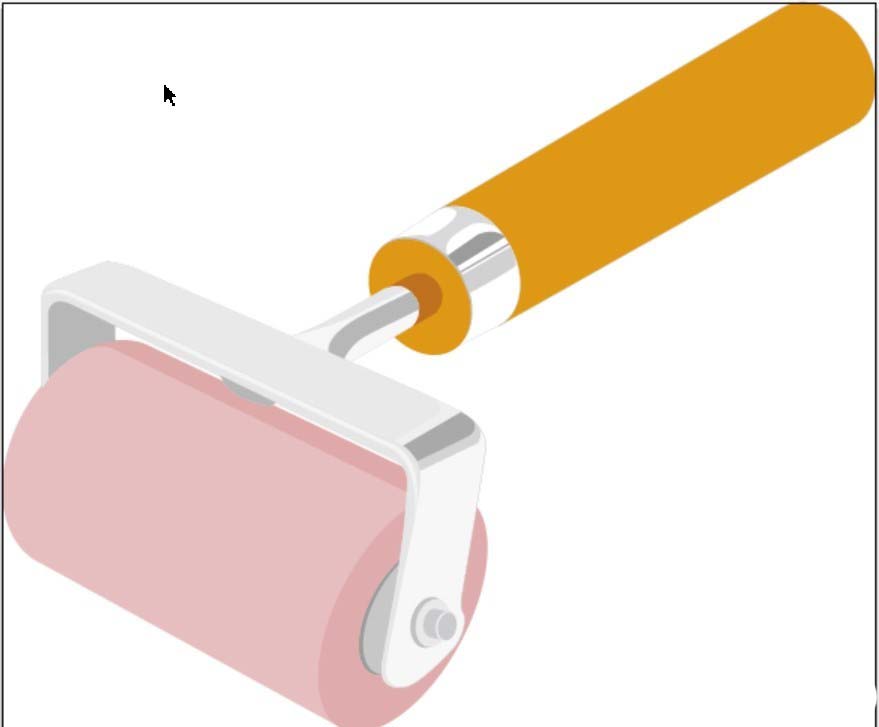 3、继续画出滚筒刷的金属夹、手柄的金属连接件,先用钢笔描绘再填充灰白色的渐变。金属连接件的前方为一个灰色的椭圆形。