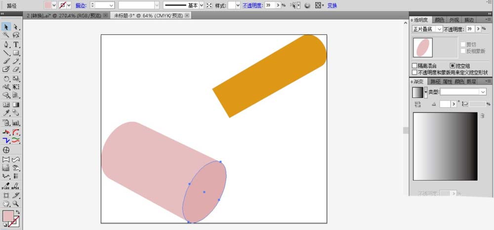 4、继续绘制手柄的左侧细节元素,我们先用圆形工具画出椭圆的路径再填充黄褐色,使用钢笔画出手柄左侧的连接金属棒路径并填充灰白色的渐变。