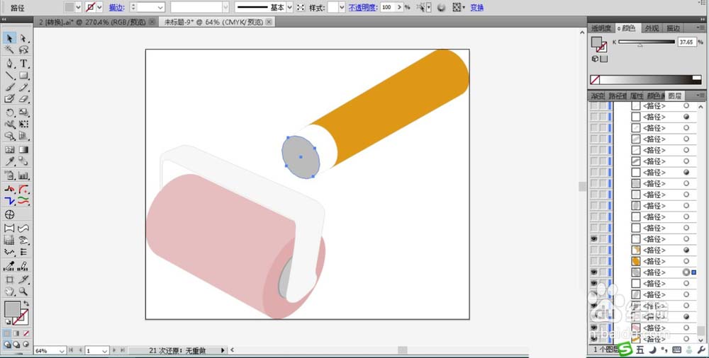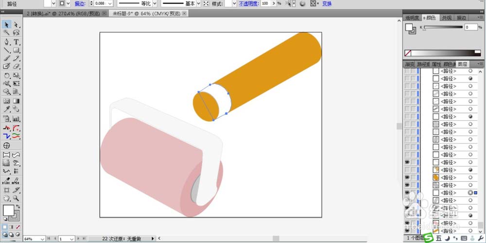 2、继续使用圆角矩形工具画出滚筒刷的圆筒、以及它的右侧面,我们用粉色填充圆筒,用暗粉色填充圆筒的侧面。