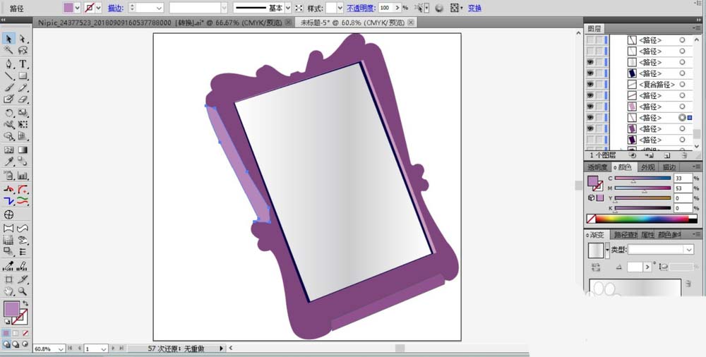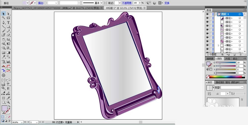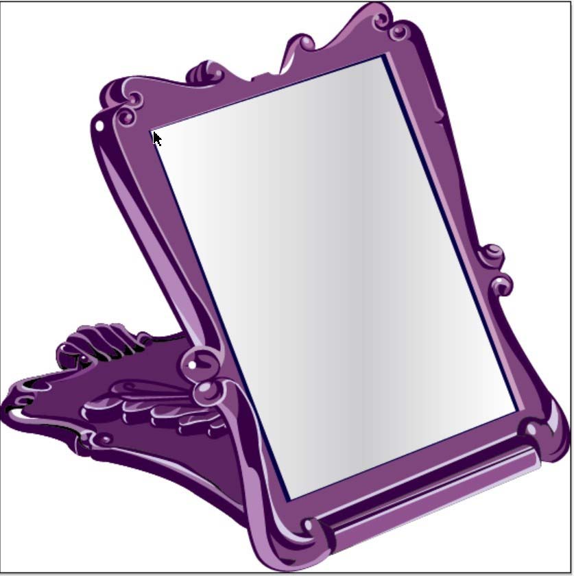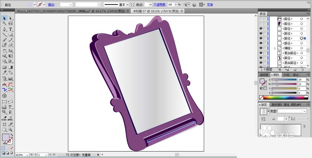 7、用同样的办法绘制出化妆镜的左侧支撑架的路径并填充紫红色,做好表面的色调细节之后,化妆镜图片设计完成。