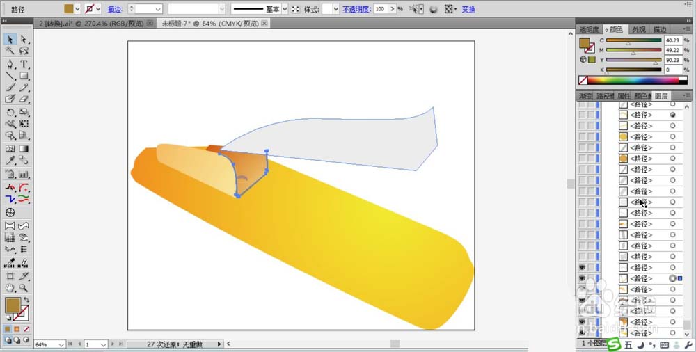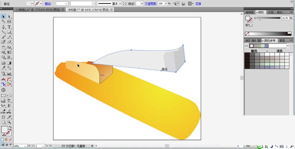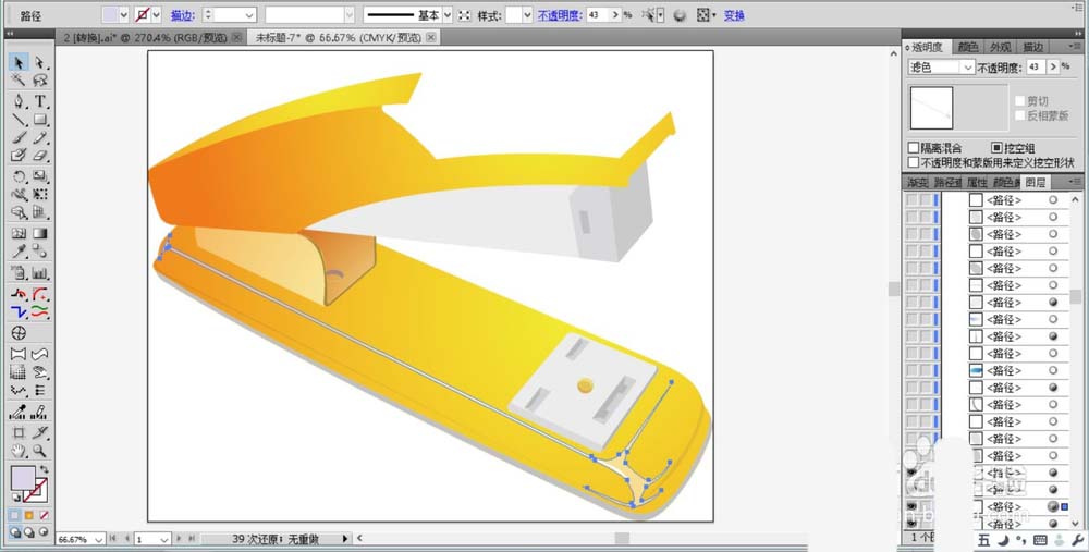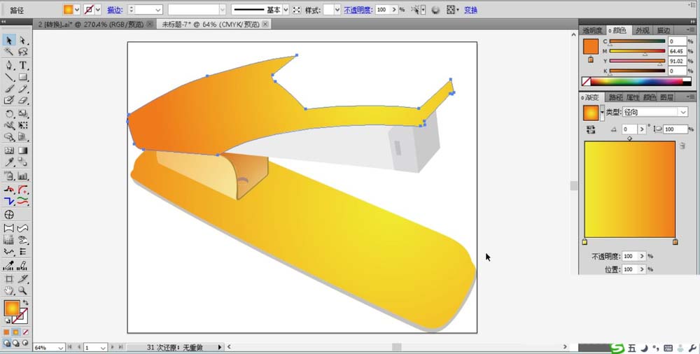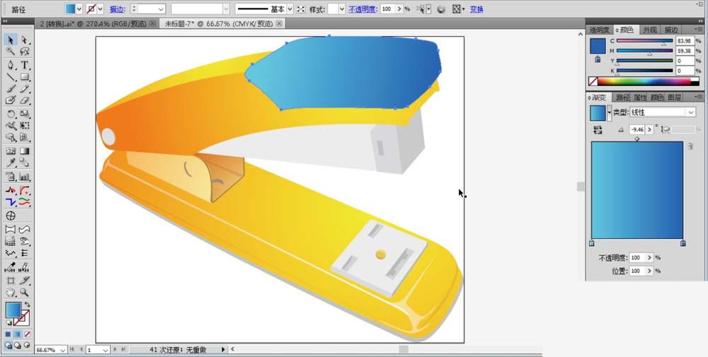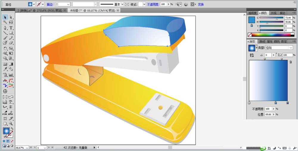 6、画出订书机上端的平面结构路径,我们用黄色的渐变填充,画出订书机手柄的前端结构,我们用蓝色的渐变填充。