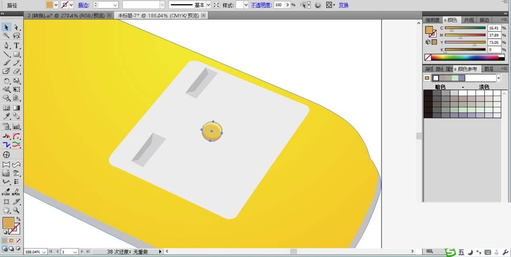 2、继续画出订书机的底座上面的一个小小的结构件,先画出它的左侧面,再画出它的右侧面,左侧面用黄色的径向渐变填充,右侧面为内部用较暗的褐色的渐变填充。