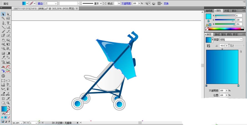 6、完成婴儿车的车把手的绘制与色彩填充,并绘制出婴儿车的遮阳布路径,我们用蓝色的渐变填充,用白色填充遮阳布的亮区。