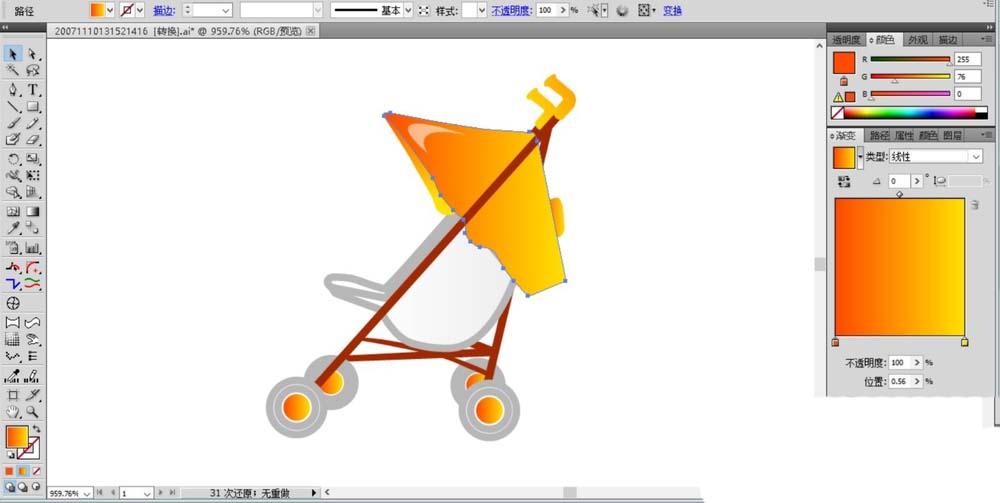 7、我们也可以改变渐变的色彩,使用橙黄色的渐变填充婴儿车的遮阳布,完成一个橙黄色风格的婴儿车的设计。