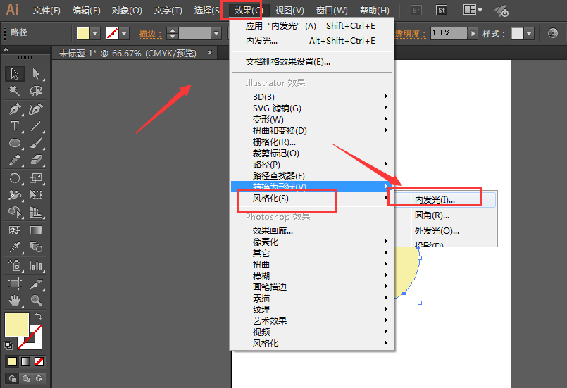 2、建好形状后,打开效果,里面的风格化中有个内发光效果,将其打开