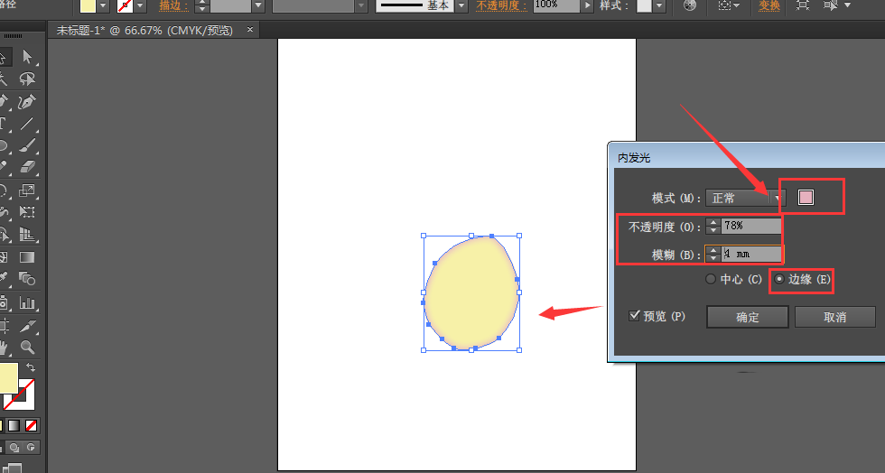 3、内发光面板中,先选择颜色,选择一个粉色,然后下面选择边缘,打开预览效果,然后调节不透明度和模糊效果,达到自己想要的效果即可