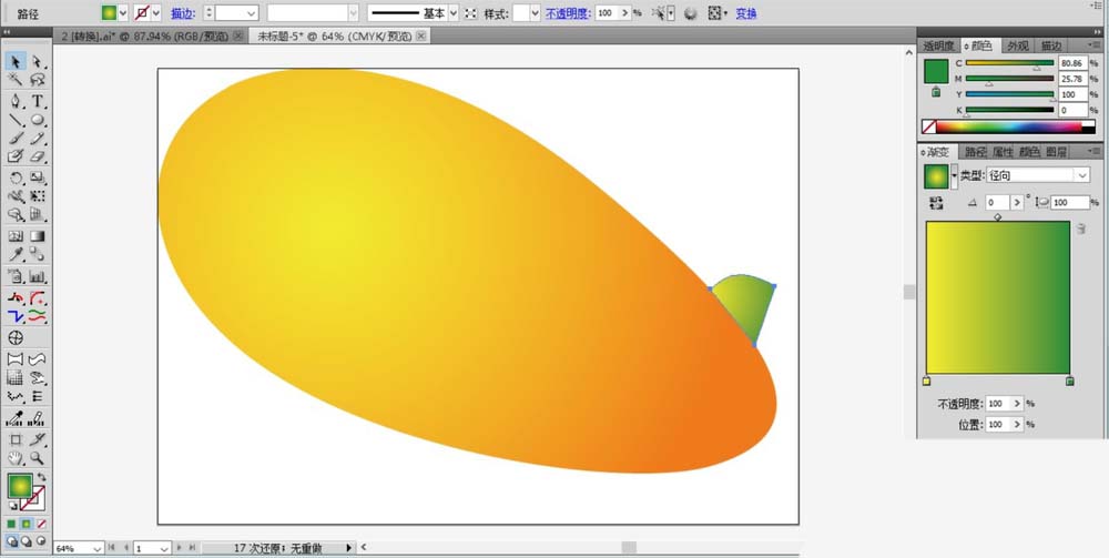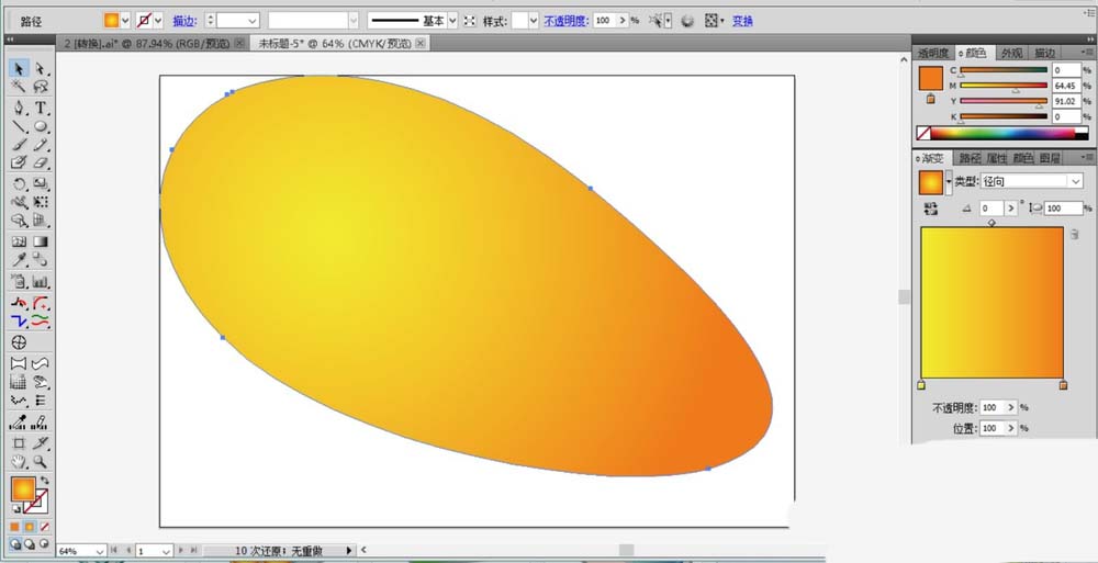 1、我们先画出一个圆形再把它变形成自己需要的飞艇形状并填充橙黄色的渐变。