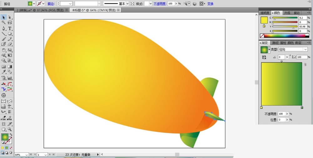 2、继续使用钢笔在飞艇的右下侧画出它的一个尾翼,我们用绿色的渐变填充。
