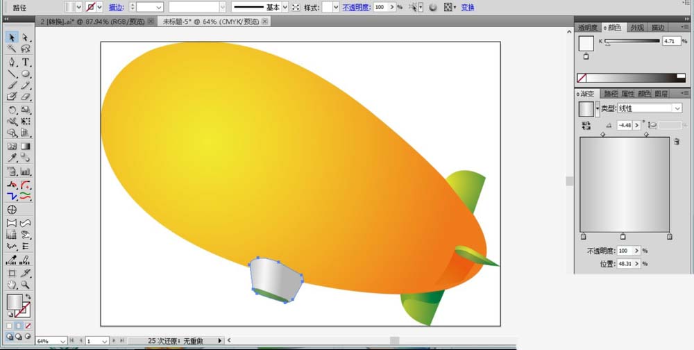 3、使用同样的办法在飞艇的尾部画出它的三只尾翼,其中右侧尾翼要画出两个侧面,分别用不同的渐变色调填充,让它的立体感觉出来。