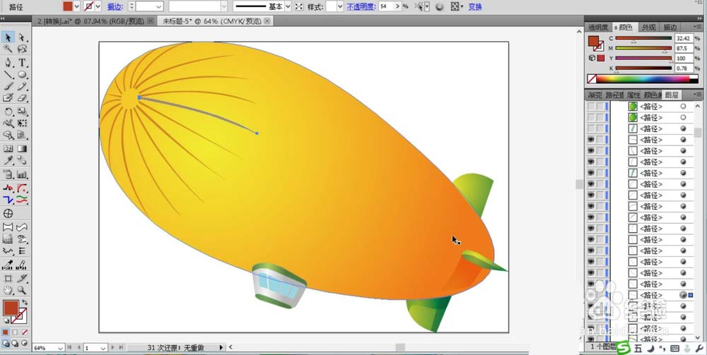 6、在飞艇的左侧大头处用钢笔勾勒出一根放散状态的丝线并用橙黄色描边,复制这个曲线让其布满整个飞艇的前部。