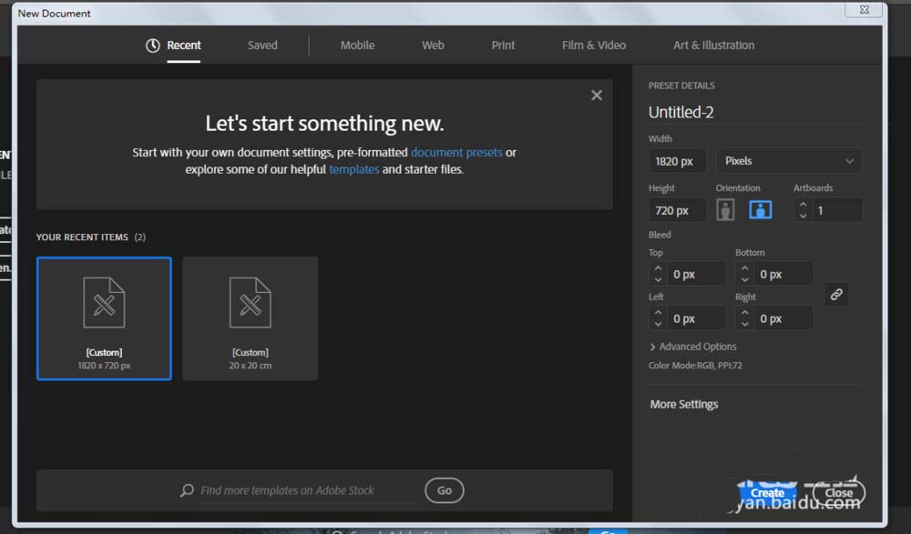 1、新建一个1820*720,颜色模式RGB的文档。