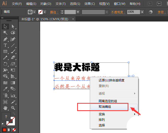 5、这样将文本拼合透明度后,然后再右键选择取消编组,如图