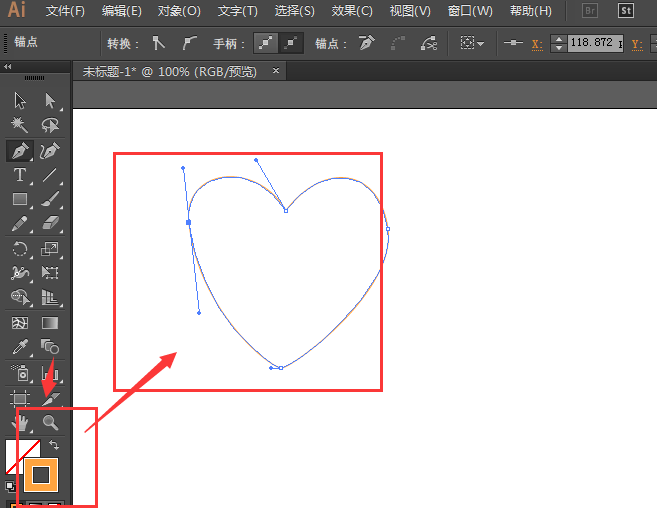 1、新建文档后,使用带有描边设置的钢笔工具,在画布上画出一个心形,如图