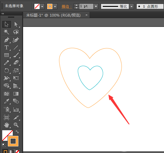 2、画好一个心形图案后,然后在复制一个将其缩小,放到大心的中间位置,并且改变下描边的颜色,如图