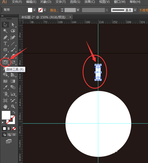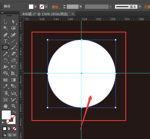 3、按住shift键在画布上绘制一个正圆形,如图所示;然后在中心位置分别拖出两根参考线