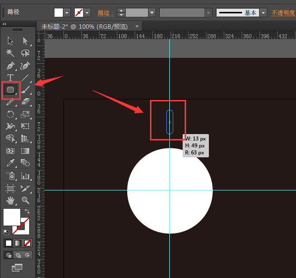 4、下面再打开圆角矩形工具,在圆正上方位置绘制小的椭圆,调整椭圆时可以使用键盘上下调整圆角角度;左右键可以快速调整为最大圆角或矩形