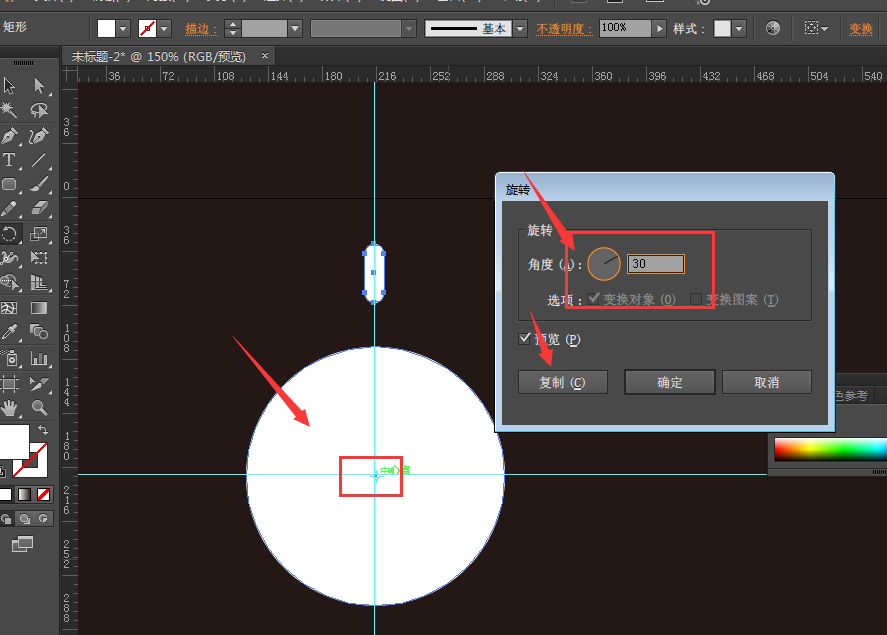 6、在正圆中心位置,按住alt键点击,输入旋转角度为30度,点击复制确定