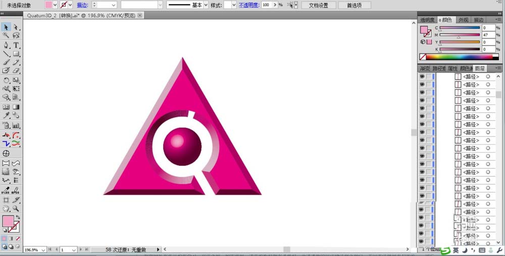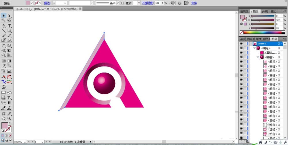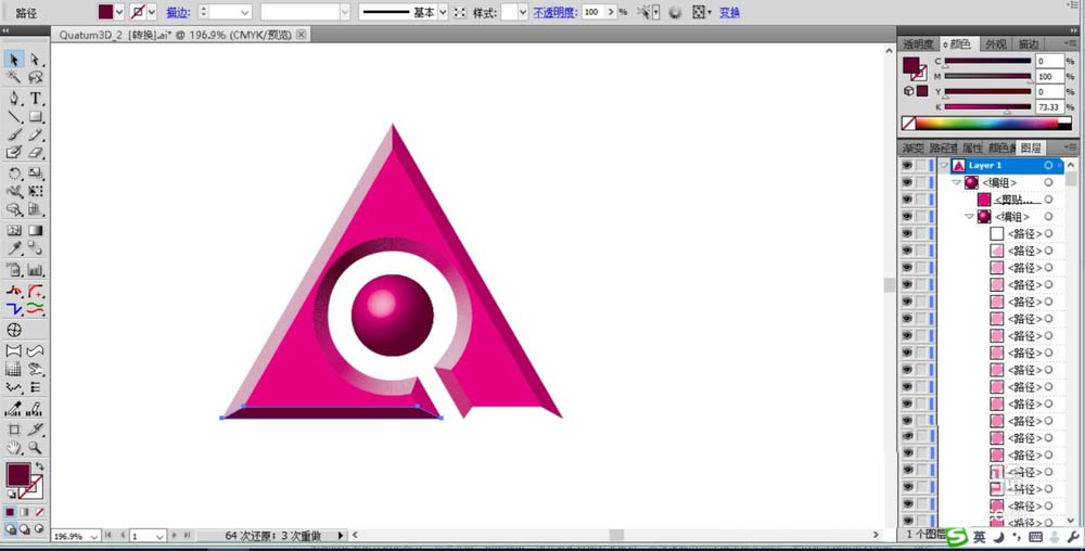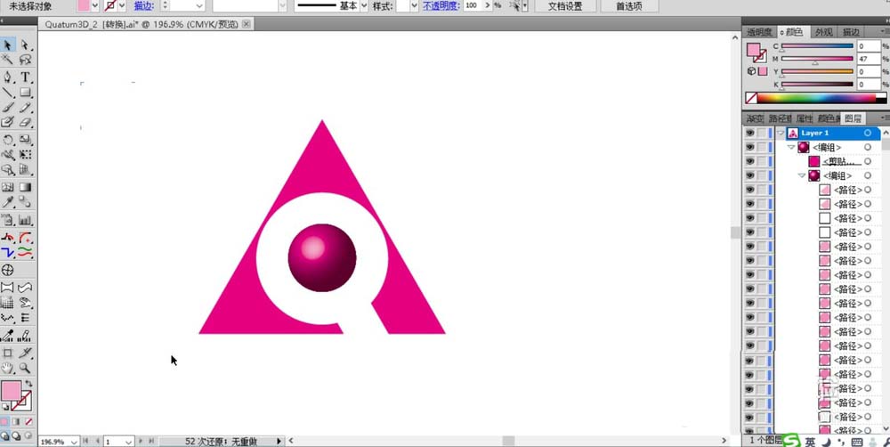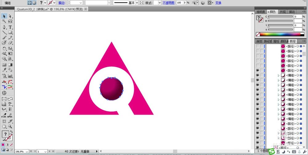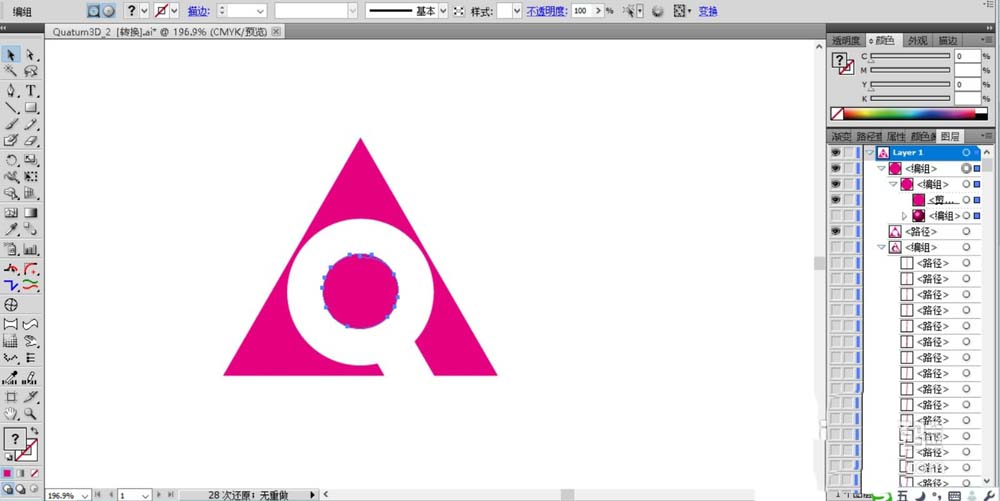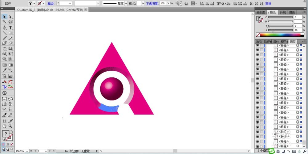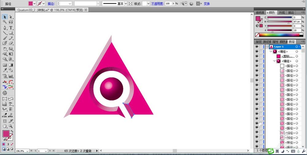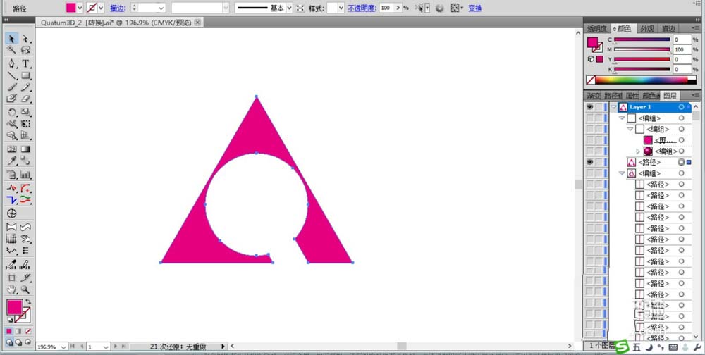 1、首先,我们在三角形当中引入了圆形的概念,先用钢笔与网格画出一个正三角形,再用圆形去截取,从而获得了一个中心圆形的三角形,我们把三角形的右下侧用矩形截取,代表了开放与发展的理念,所有的路径填充品红色。
