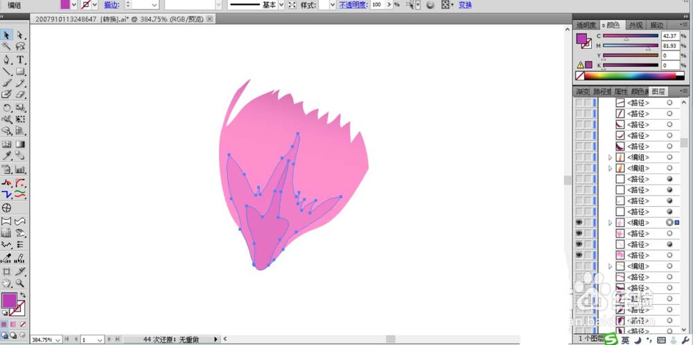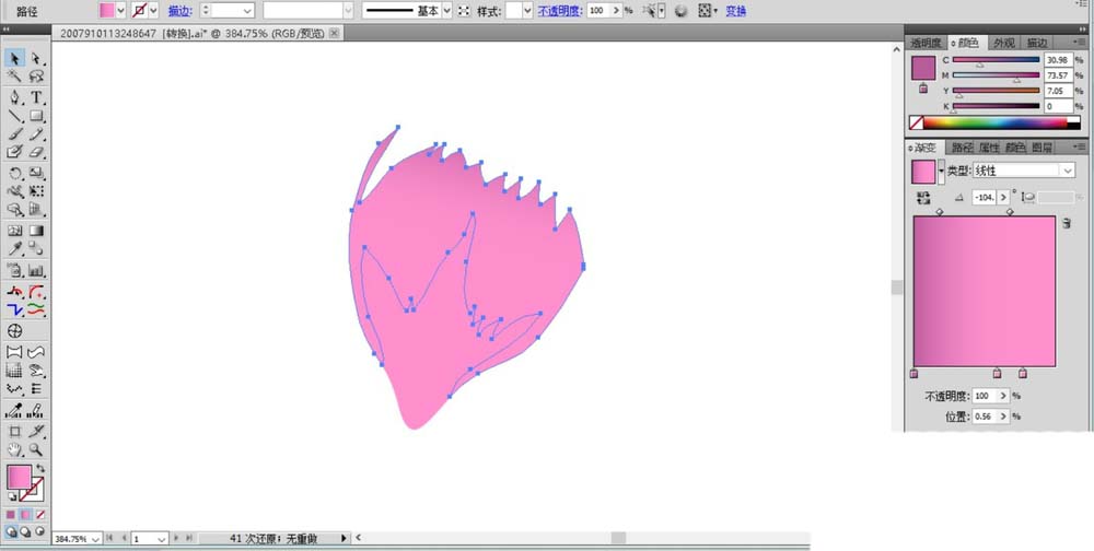 1、先用钢笔画出一片藏红花的花瓣形状路径,我们用桃红色的渐变填充这个路径。