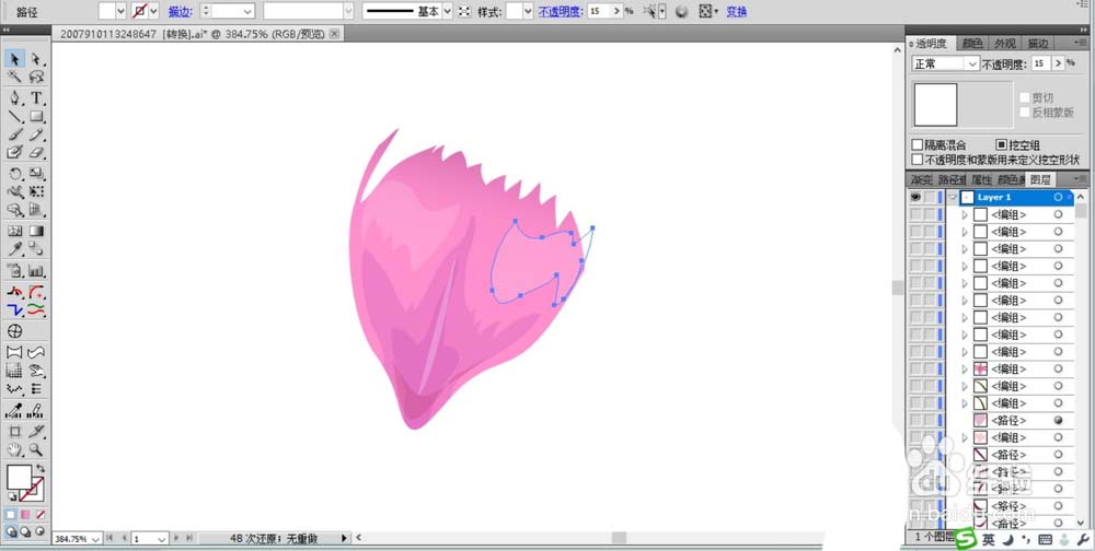 3、画出花瓣上方的亮区路径,我们用半透明的白色填充左右两侧的亮区路径。