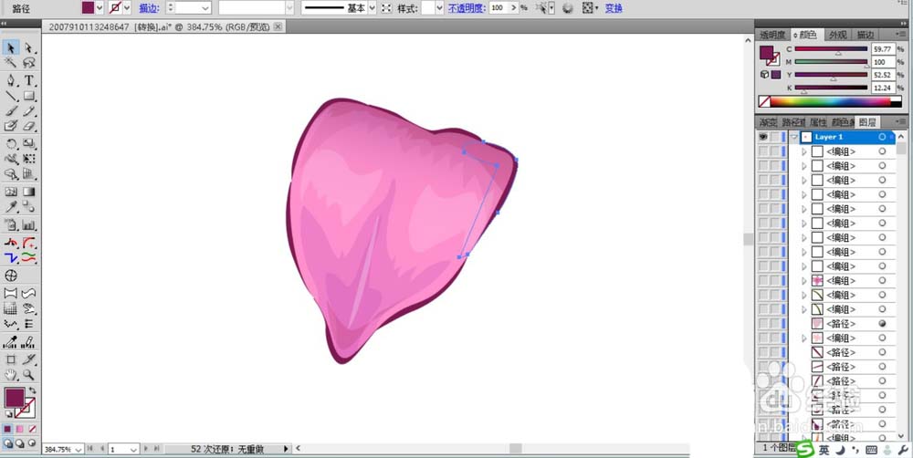 2、画出这片花瓣的下方的暗区路径,我们用暗粉色填充这个暗区路径。