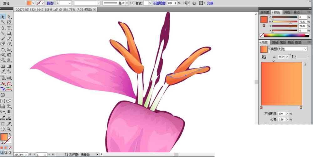 6、接着,我们画出花蕊中间的橙黄色的花心的路径并用橙黄色的渐变填充,暗区路径用暗橙色填充,亮区用半透明的白色填充。