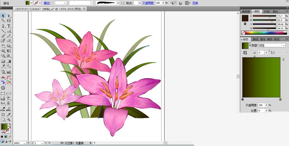 9、画出藏红花周围的长长绿叶,绿叶的主体用绿色的渐变填充,绿叶的暗区用暗绿色填充。
