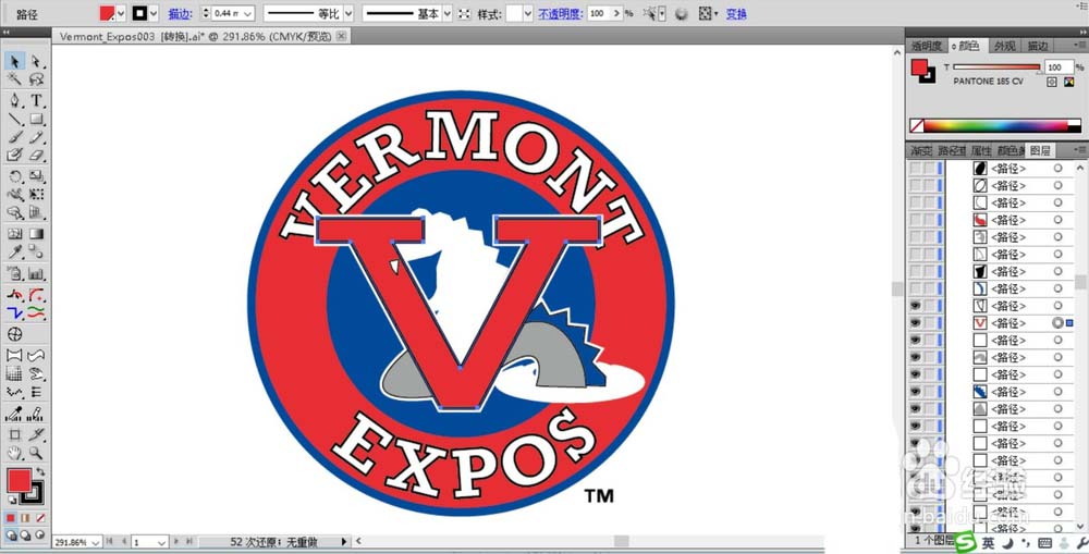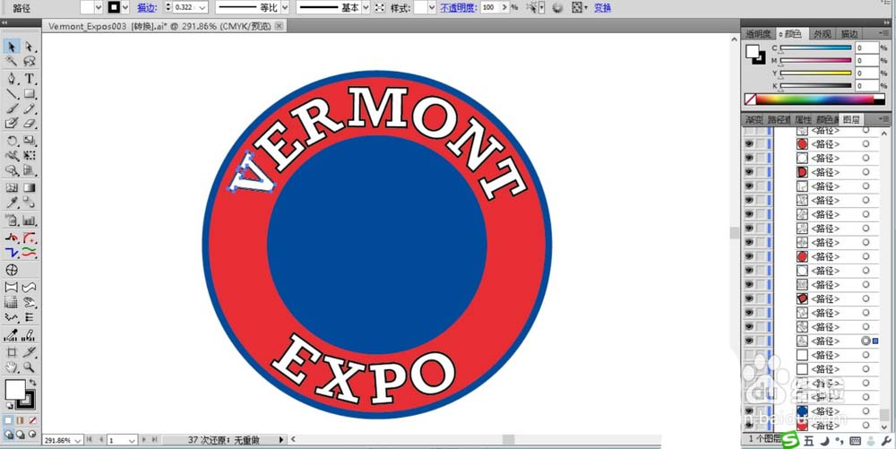 1、这个案例使用了圆形与V字母相结合的方式,从而很好的把字母V与标志结合起来。先使用圆形工具画出一个正圆形,我们用红色填充,用蓝色进行描边。