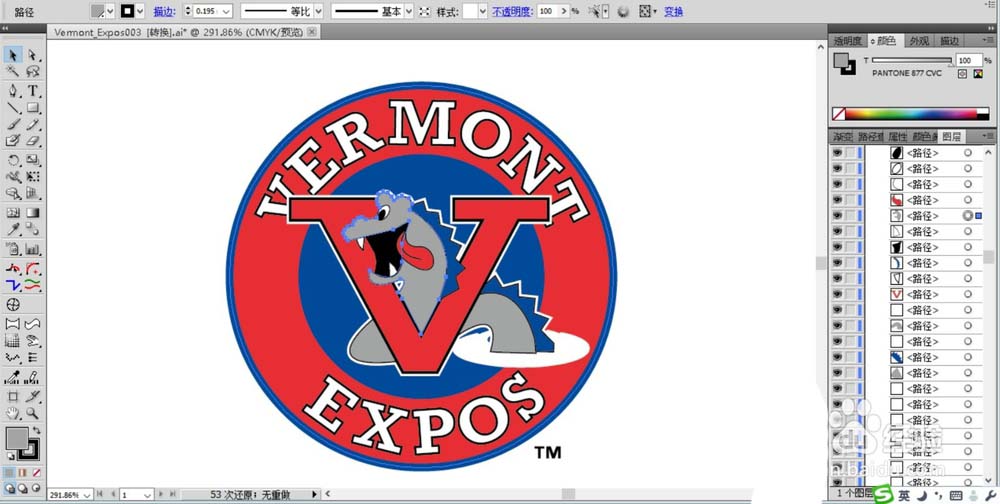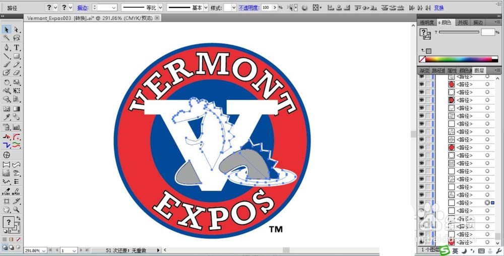 6、复制字母V并缩小95%后填充红色,让两层文字中心对齐。对于马的路径在蓝底上面的部分用白色描边。