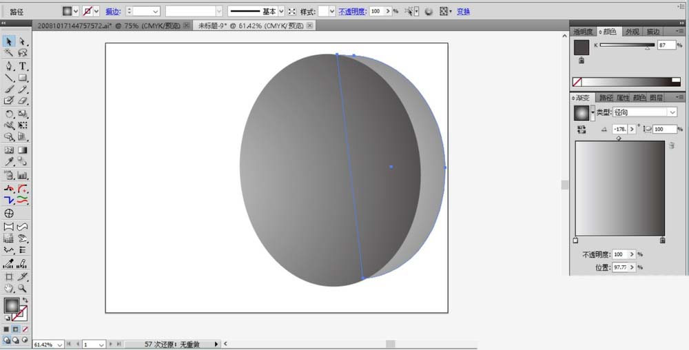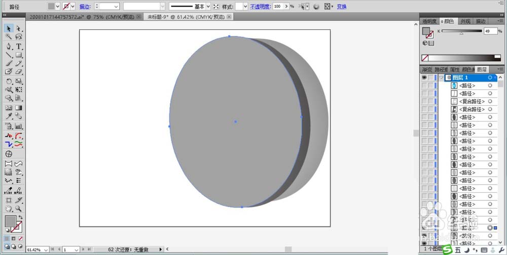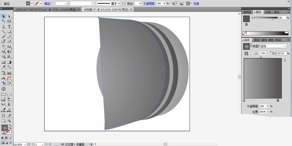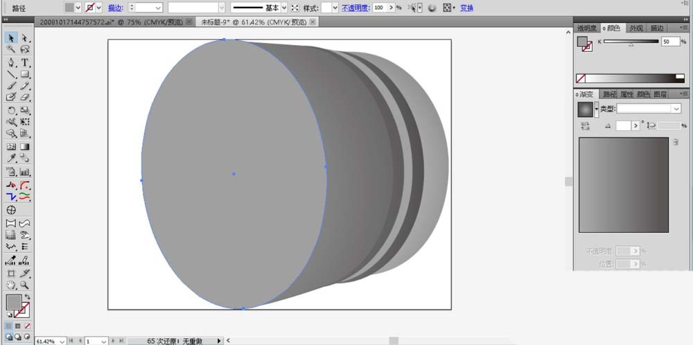 3、我们继续复制这个椭圆路径并向左移动几次再用灰色的渐变填充,我们就有了一个中间黑色,两侧浅色的圆形部件。