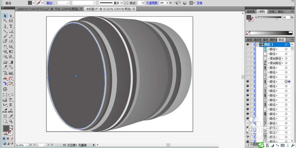 4、这一步开始绘制相机镜头的大镜头框架路径,我们先用钢笔画出一个镜头的右侧面路径并用灰黑色的渐变填充,接着复制这个路径向左移动几次再用灰色的渐变填充,最后,我们使用圆形工具画出一个椭圆的路径覆盖在上方并用浅灰色的渐变填充。