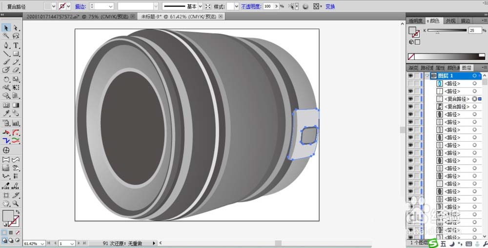 7、接着,我们绘制出相机镜头的右侧金属扣的基本路径,用灰黑色填充左侧面,用灰白色填充右侧面,让金属扣的立体感觉出来。