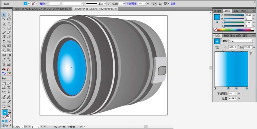 8、最后一步就非常简单了,我们用圆形工具画出蓝色玻璃的基本路径并填充一个蓝色的渐变,完成相机镜头设计。