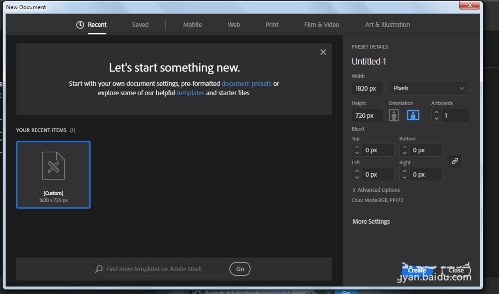 1、新建一个1820*720,颜色模式RGB的文档。