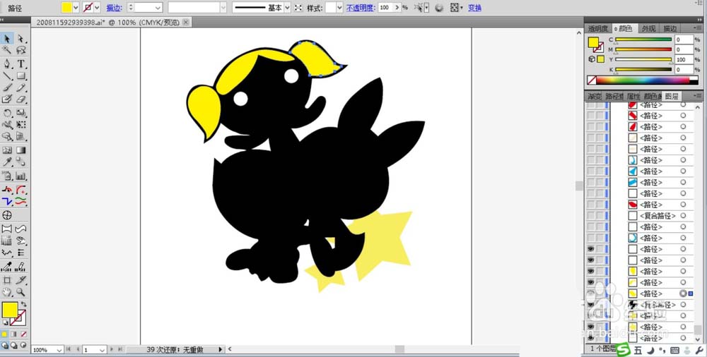 4、我们用黑色填充小孩的剪影路径,用黄色填充左上角小孩的头发路径。用白色填充眼晴的中心路径。右下角的星星用淡黄色填充。