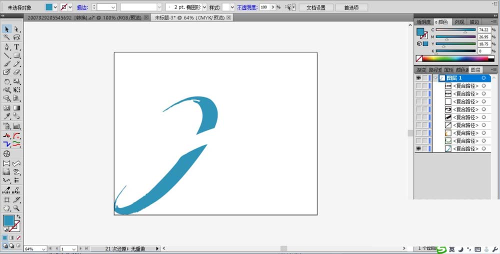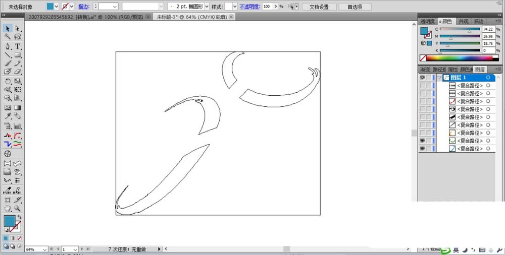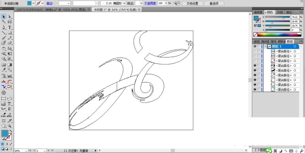 3、继续用同样的办法对于圆弧进行复制与变形,我们绘制出第三个圆弧环,对于圆弧环的两个端点进行锚点的处理,让其更有毛笔字的感觉。