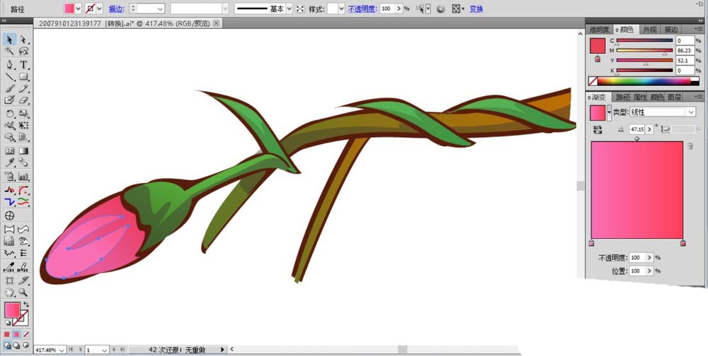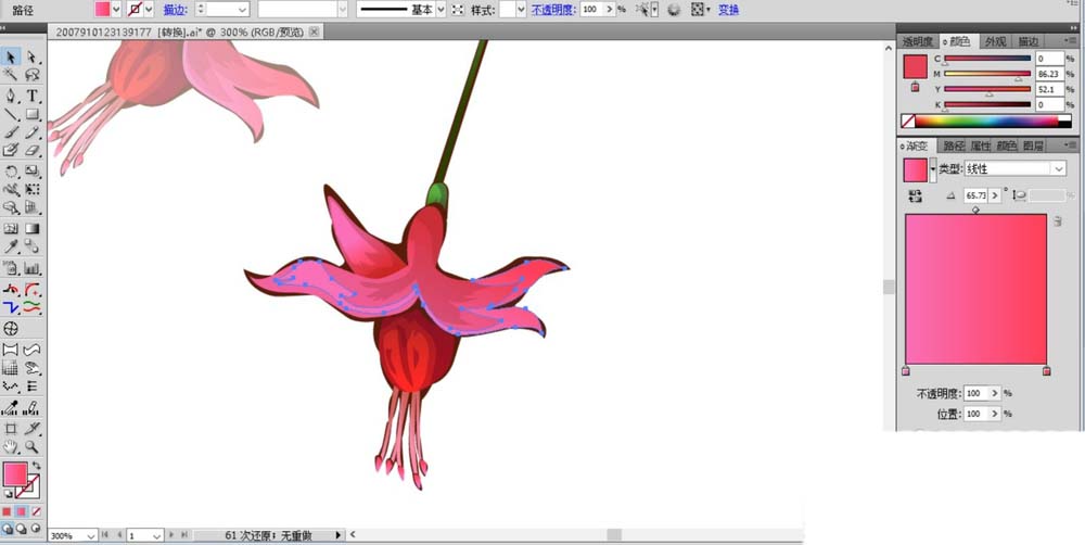 4、这一步开始绘制海棠花的花朵,我们用粉红色填充花朵的花瓣,用桃红色的渐变填充花朵的高光路径。绿叶区域用暗绿色填充,高光区用浅绿色的渐变填充。