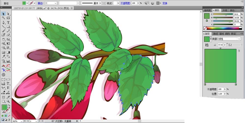 8、这一步开始绘制绿叶的路径,我们用绿色填充暗光区域,用浅绿色的渐变填充高光区域路径,复制绿叶并改变大小,让绿叶集中在花朵的右侧区域。