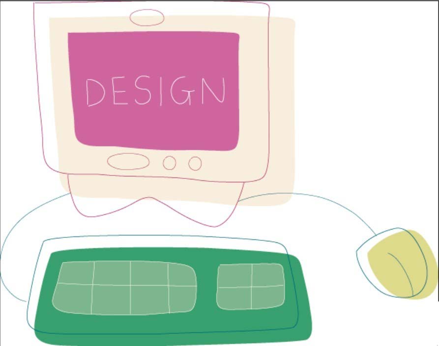 6、用粉红色填充屏幕正面,用淡绿色填充鼠标,完成手绘电脑设计。