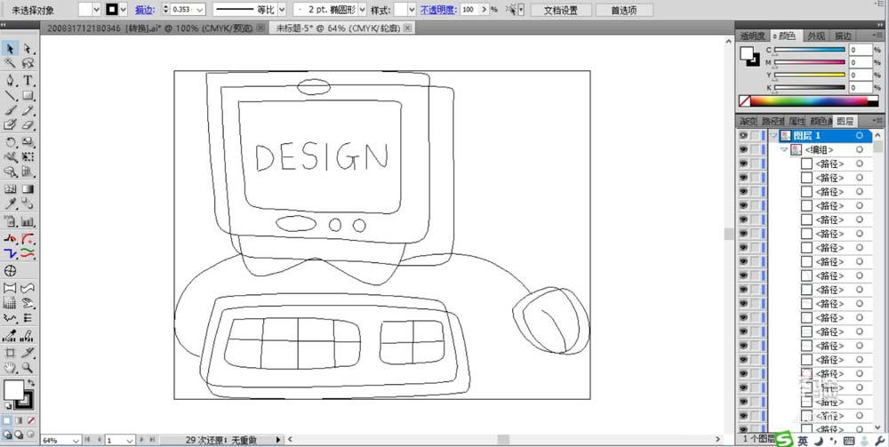 3、这一步就是各种细节元素的绘制,鼠标的连接线,屏幕上面的文字与一个个的按键,还有按键上面的横线与竖线。