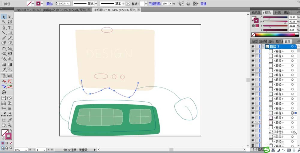 5、对于所有的元素进行描边,用绿色描边键盘,用淡绿色描边鼠标线,用粉色描边屏幕上面的元素,用白色描边文字。